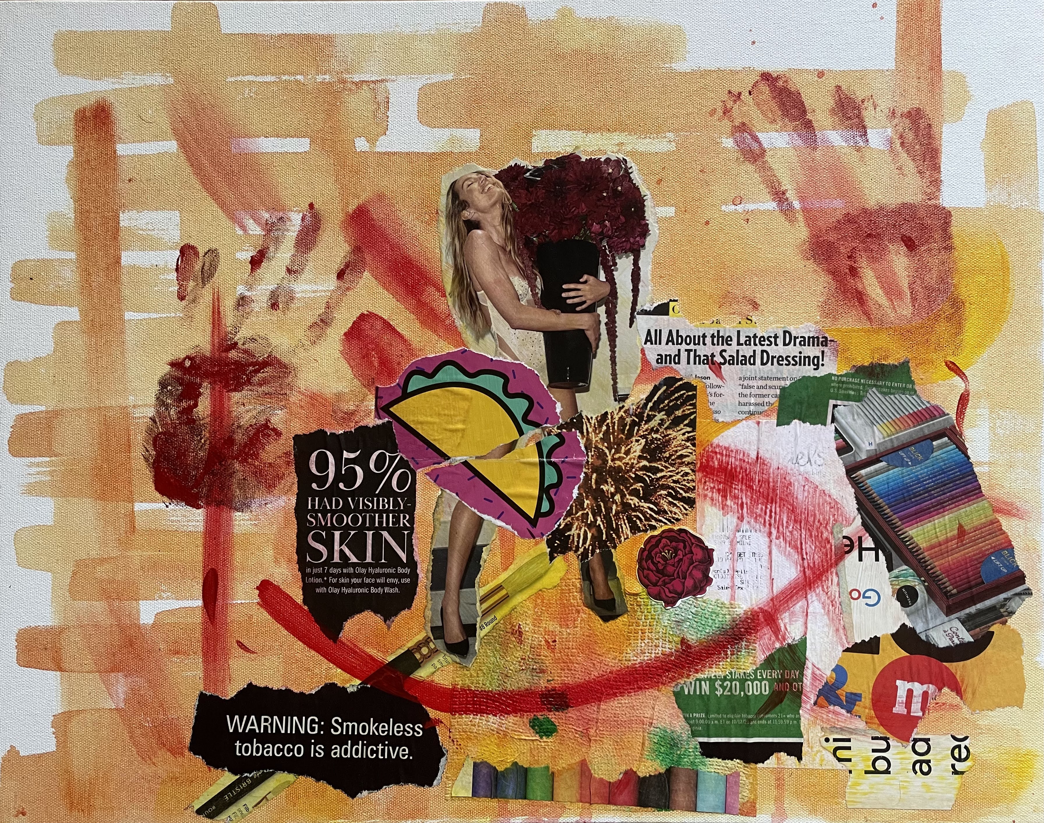acrylic paint, magazine scraps, canvas board