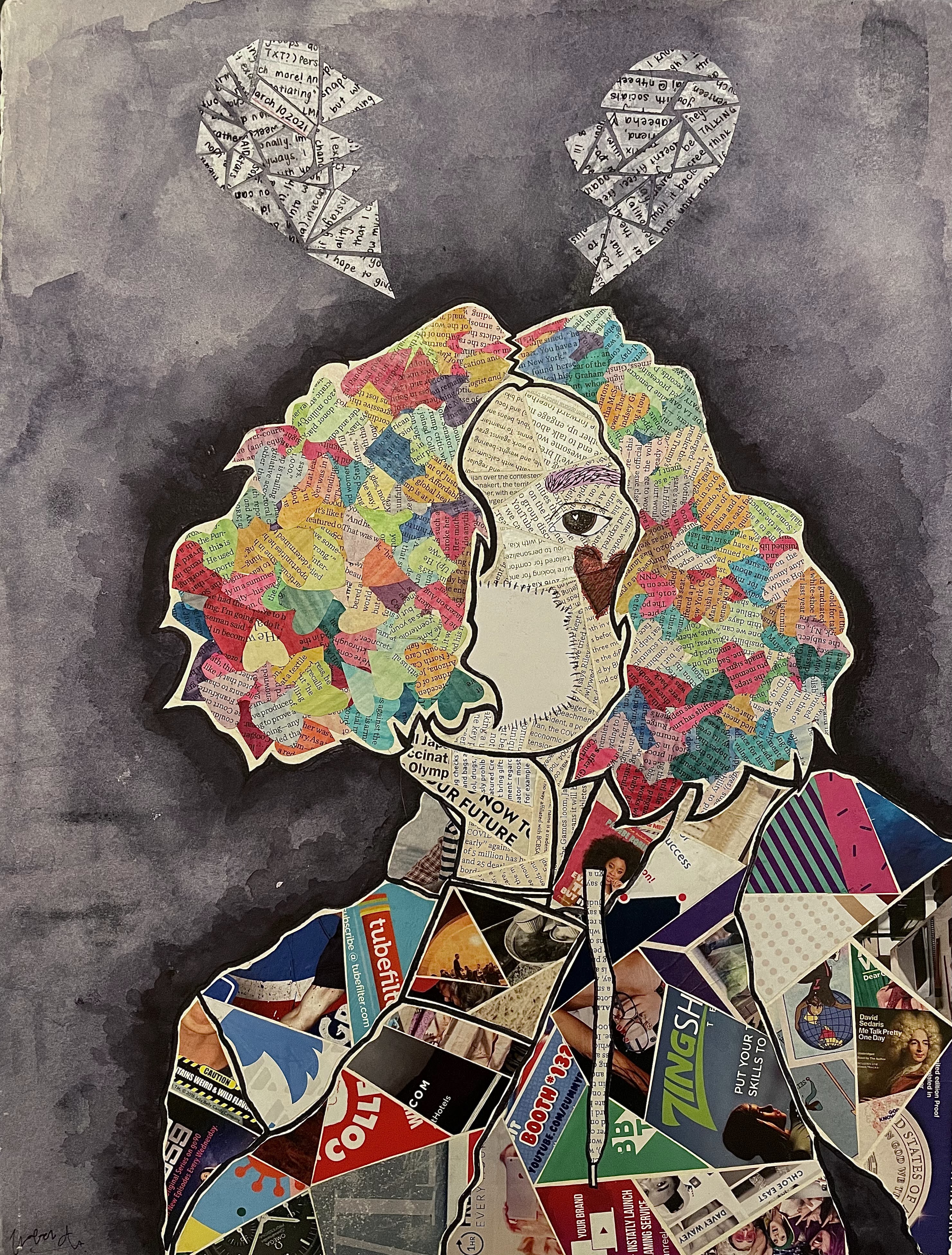 acrylic paint, gel pen, alcohol marker, magazine scraps, watercolor paper